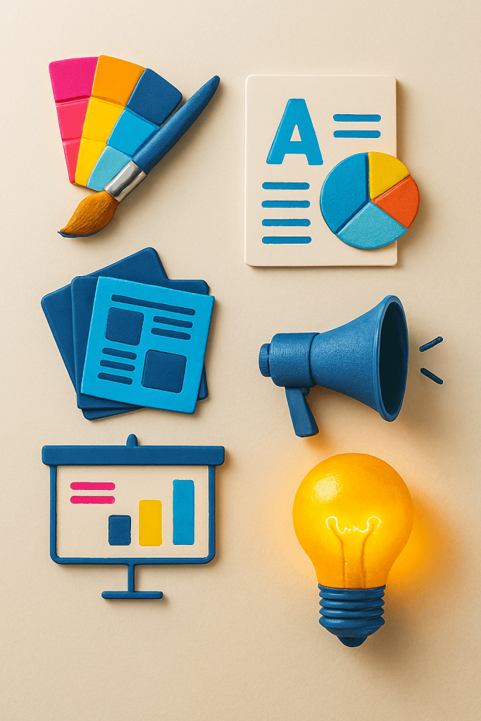 ابتكار الشعار، اختيار الألوان، تحديد الخطوط، وأنماط التصميم الخاصة بالعلامة التجارية.
